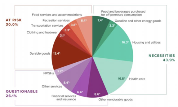First, let’s take a look at what is most at risk. According to Morning Consult, nearly two-thirds of a typical consumer’s budget is considered “at risk” or “questionable”. And if you look at those slices of the pie, many are pretty small already. Even a fraction of a percentage drop has drastic effects on businesses.